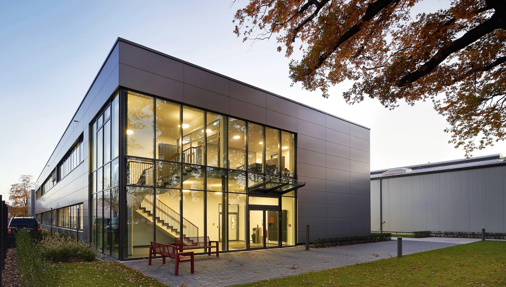 Der Neubau gliedert sich in einen langgestreckten, zweigeschossigen Hauptbaukörper sowie eine angebundene, eingeschossige Technikumshalle. Die klare volumetrische Struktur schafft eine eindeutige funktionale Zuordnung und formuliert zugleich eine ruhige architektonische Präsenz im industriellen Kontext.