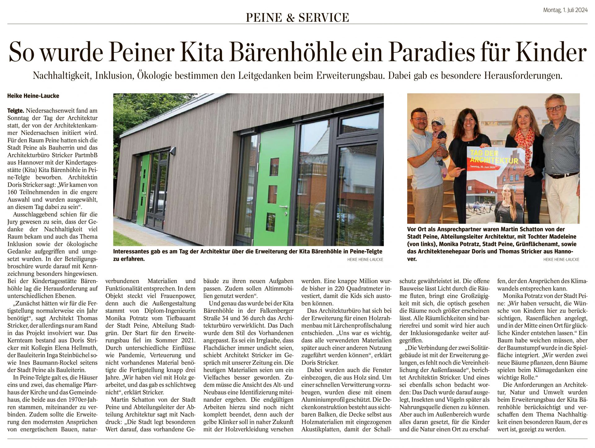 Die ArchitekturZeit in Niedersachsen und damit auch der Tag der Architektur 2024 sind vorbei! In diesem Jahr wurde besonderer Wert auf die Themen Nachhaltigkeit & Weiterbauen im Bestand gelegt. Wir durften mit unserem Erweiterungsbau der Kindertagesstätte »Bärenhöhle« in Peine ebenfalls ein Teil der Veranstaltung sein und einen Einblick in das Projekt geben.