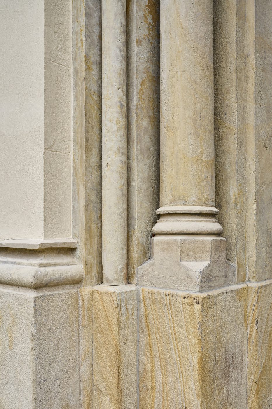 Im Rahmen der Fenstererneuerung werden Schäden an den Putzfassaden und Sandsteinelementen saniert und die Fassaden neu beschichtet.